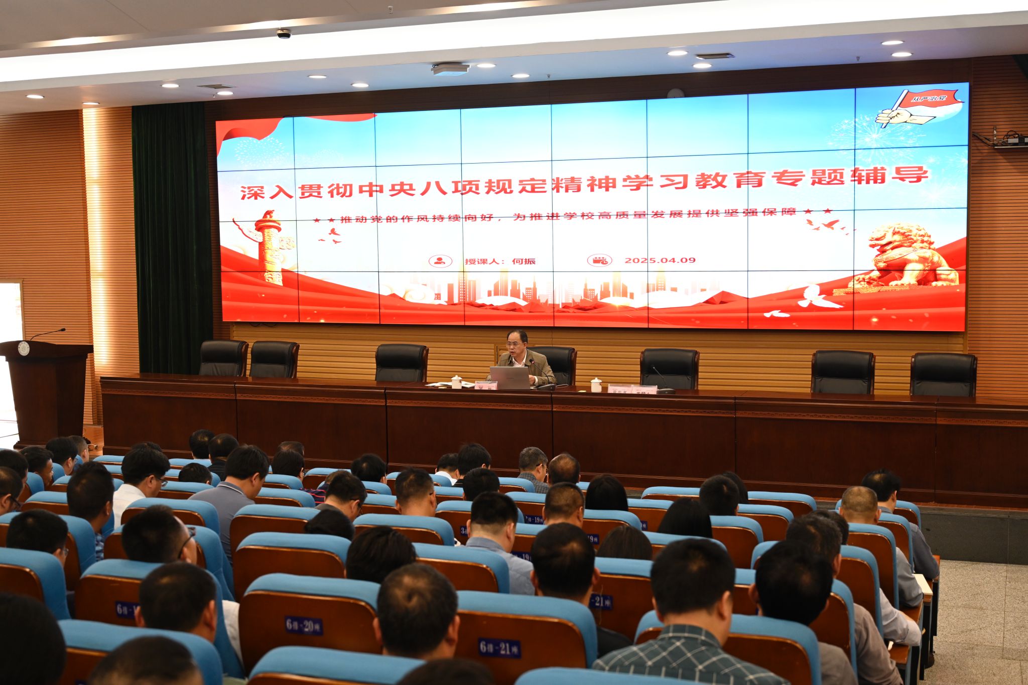 党委委员、组织部部长吕贤军作了题为“学习中央八项规定及其实施细则精神”的辅导报告。他指出,在全党开展深入贯彻中央八项规定精神学习教育,是对党员干部思想理论的一次再教育、再武装,是对纪律作风的一次再检阅、再提升。要深入学习贯彻习近平总书记关于党的建设的重要思想、关于党的自我革命的重要思想,锲而不舍落实中央八项规定精神,做到常思深悟、细照笃行,推动学习教育入脑入心、见行见效,为学校高质量发展提供坚强的纪律保障。