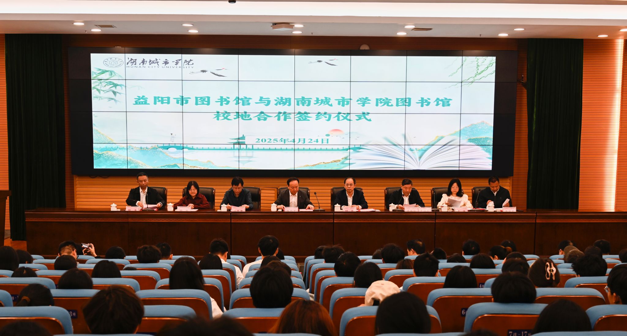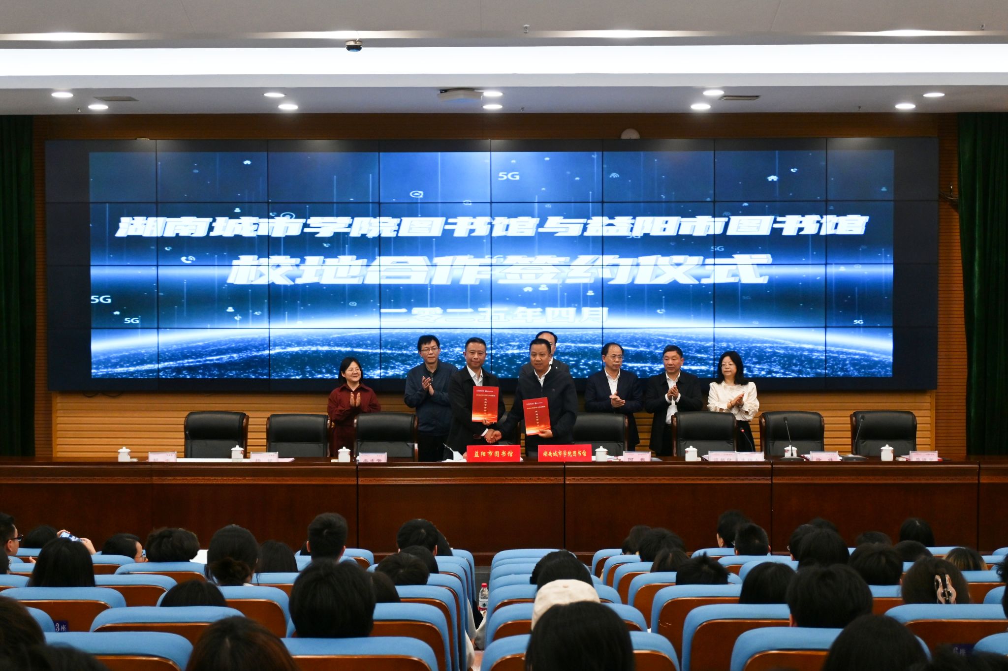 本网讯(通讯员 向春霞)4月24日下午,江南在线与益阳市图书馆校地合作签约仪式暨2025年“书香城院”阅读推广活动在学校图书馆报告厅举行。益阳市人大常委会党组副书记、副主任陈伟志,校长何振,副校长谭献良、徐姝出席启动仪式,仪式由谭献良主持。