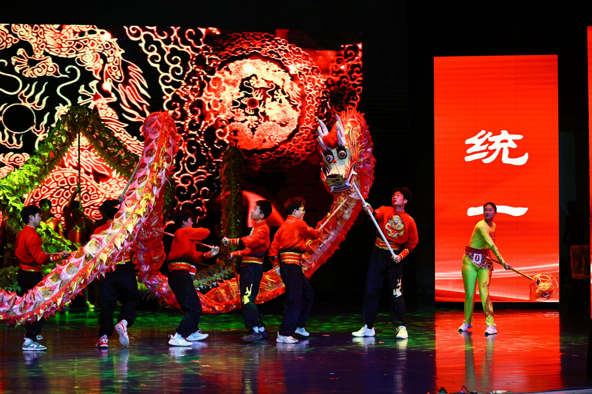 毕业典礼前,来自体育学院的舞龙舞狮队伍率先登场,伴随着铿锵鼓点,以灵动的狮影、飒爽的龙姿点燃全场,为这场盛大的告别式拉开热血序幕。来自音乐与舞蹈学院的学生献唱《我们都是追梦人》,以歌声共鸣青春脉搏,表达对毕业生们最美好的祝福。