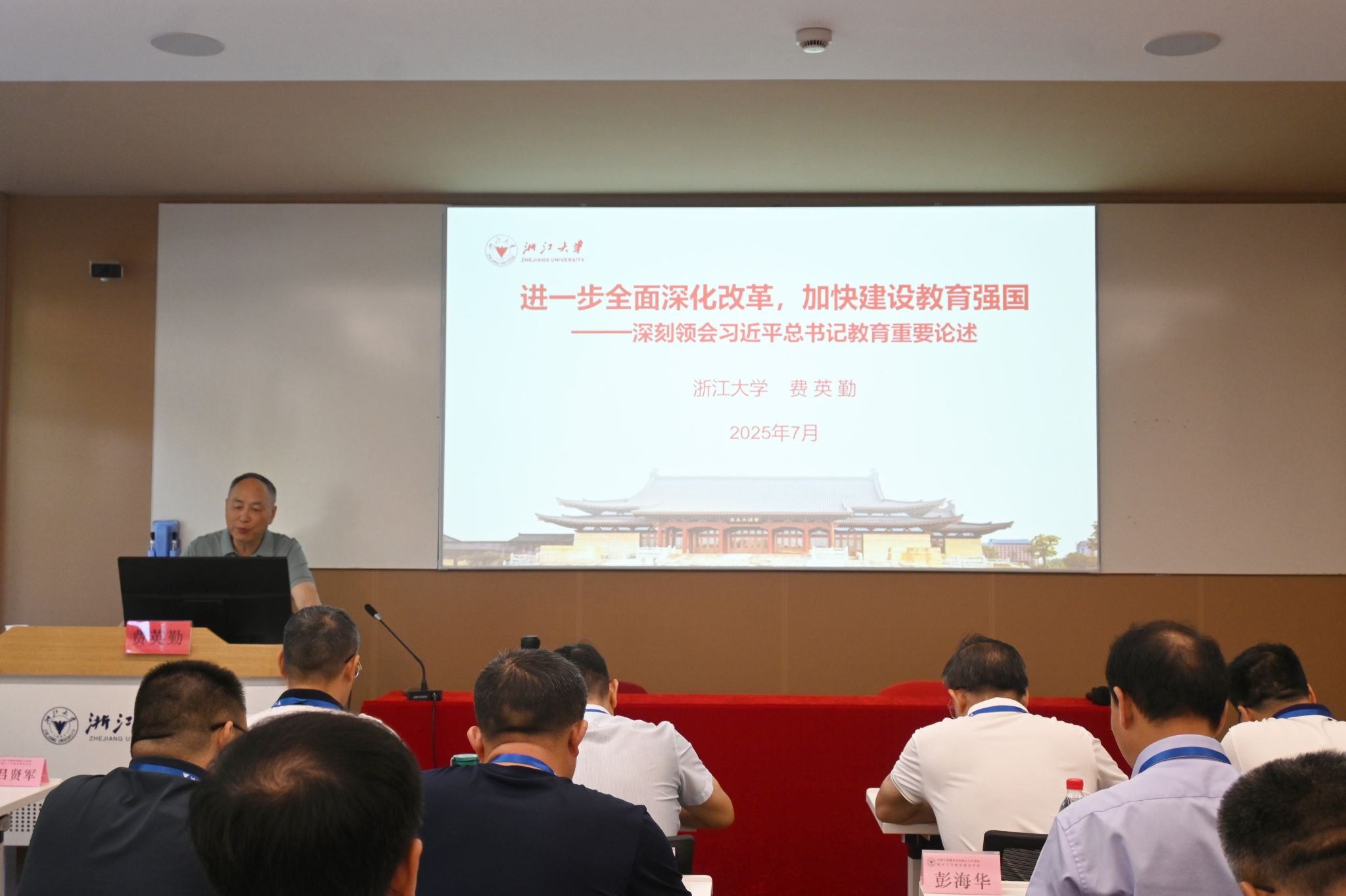 培训班的“行走课堂”同样精彩。在嘉兴南湖红色教育基地南湖革命纪念馆,大家追寻着革命先辈的足迹,看着那一件件珍贵的文物、一幅幅生动的图片,仿佛穿越回那段波澜壮阔的历史岁月。在党旗下,何振带领全体学员庄严宣誓,誓言铮铮,表达着对党的忠诚和为教育事业奋斗的决心。走进浙江大学校史馆,竺可桢老校长的“两问”(来浙大做什么?将来毕业后做什么样的人?)引发热议。大家纷纷表示,竺老校长百年前就在思考育人本质,我们更得把“为党育人、为国育才”的答案写实。而浙江大学行政服务办事大厅的高效便捷服务模式,也为优化学校行政服务流程,实现“师生办事零跑腿”提供了宝贵的借鉴。智慧校园建设与管理中心负责人周新邵笑称:“此次带回学校的还有从行政大厅‘顺’来的流程图手册,这些可是‘抄作业’的模板,得让咱们的师生也体验‘秒办’的快乐!”