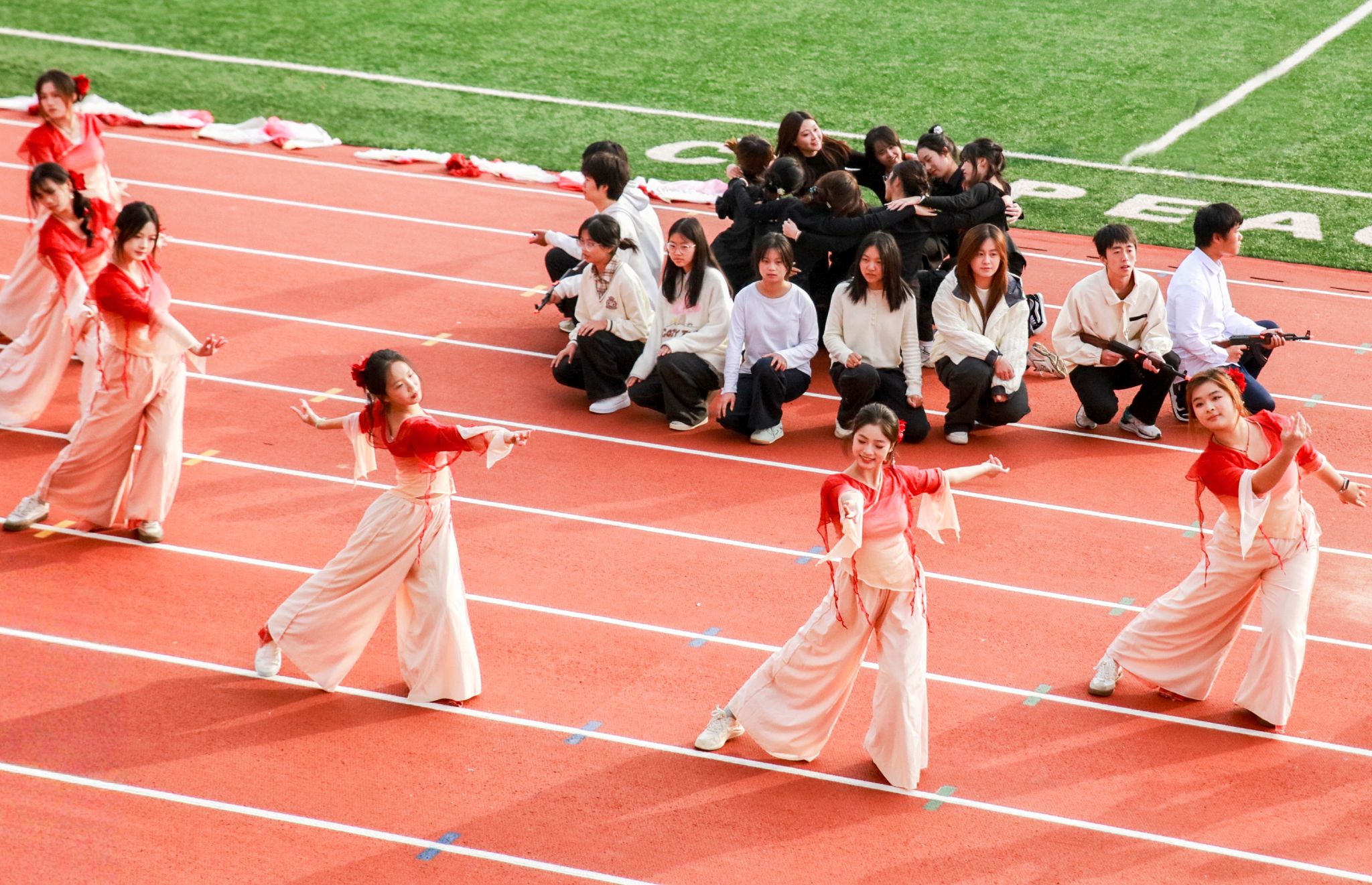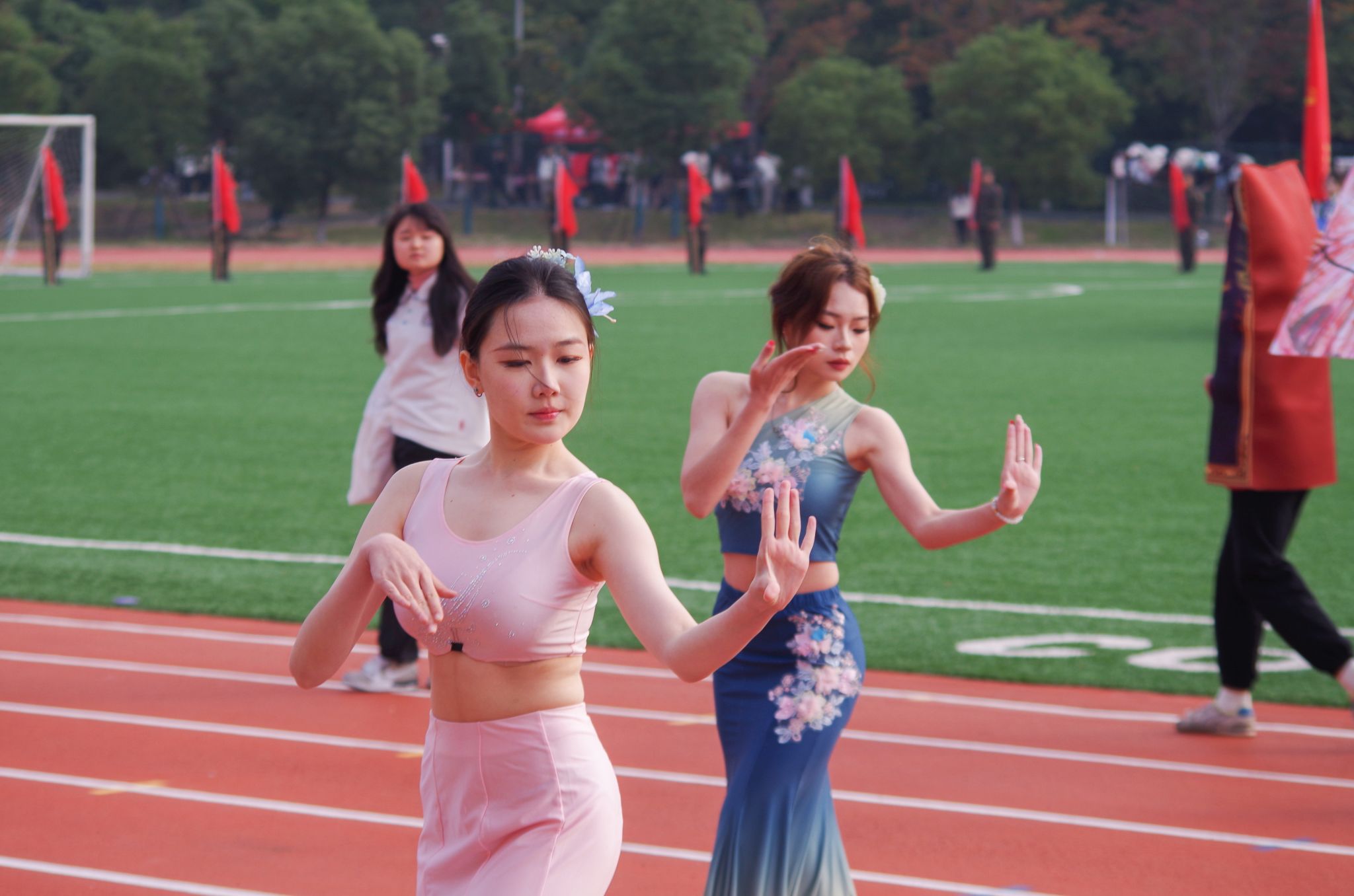 在入场式中,各二级学院运动员们还为现场观众献上了一场精彩纷呈的视觉盛宴。马克思主义学院的学子们执绸扇而来,以“赤韵”为热血注色,以“象行”铸拼搏之姿惊艳全场。管理学院带来的舞蹈《九州同》,将古典的底蕴与青春的脉搏同频,大气的力量与柔美的韵致交融,她们身穿一袭赤衣,如旭日映山河,手执一把长扇,似长风卷云霄。音乐与舞蹈学院带来舞蹈《sunshine》,她们用流畅线条勾勒活力,明快节奏传递热诚。其余13个学院也带来了精彩绝伦的表演,赢得了师生一致好评,现场欢呼与掌声交织在一起,持久不断。