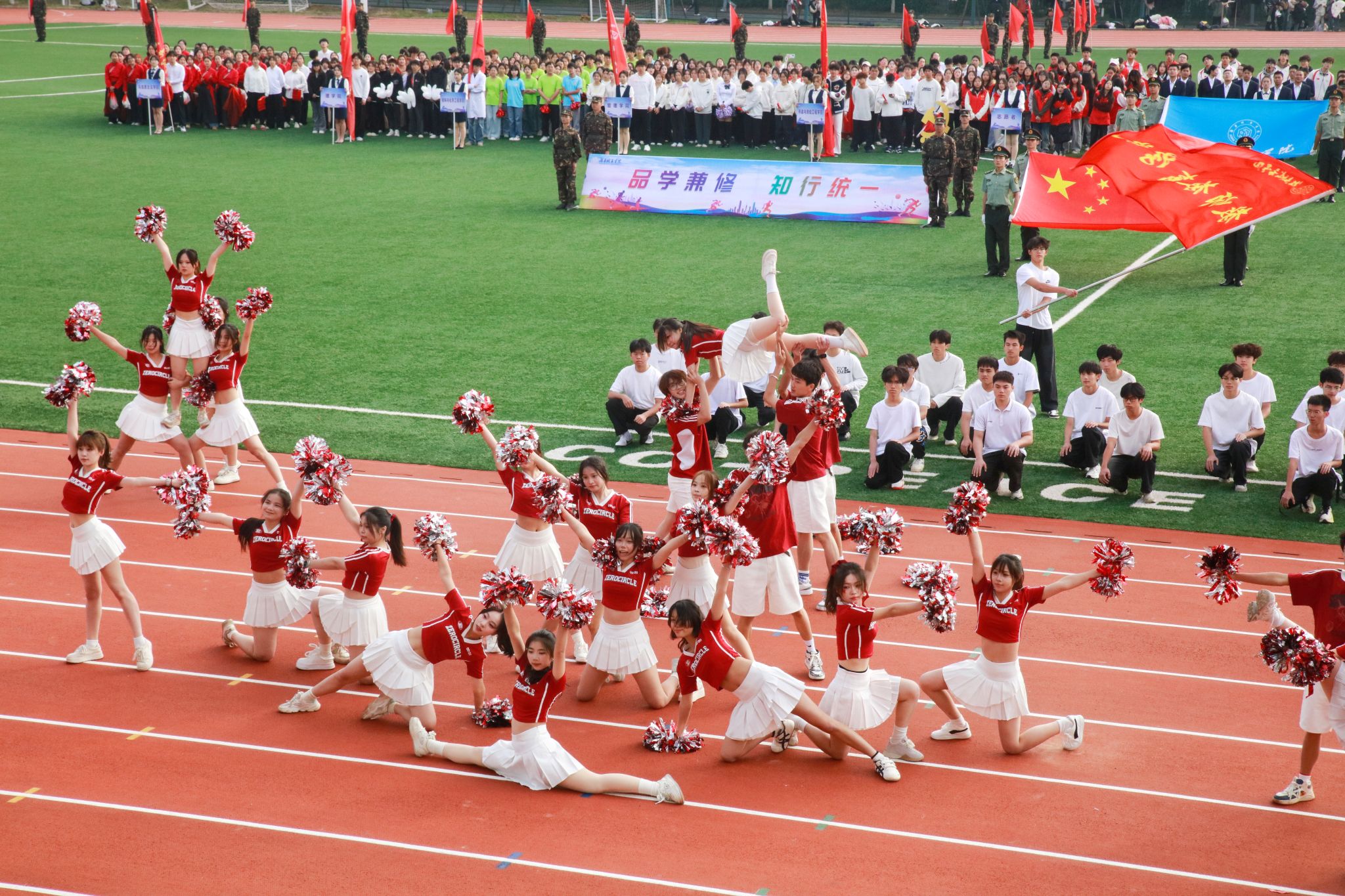 本次运动会以“阳光体育,靓丽青春”为主题,上午8时整,伴随着激昂的《运动员进行曲》,四名旗手高擎五星红旗,引领入场队伍稳步迈进,紧随其后的是校旗校训方阵、教导队方阵、裁判员方阵、志愿者方阵、各二级学院运动员代表方阵,他们信心百倍、精神抖擞,迈着整齐的步伐,阔步走向主席台,豪迈自信的声音响彻整个田径场上空。