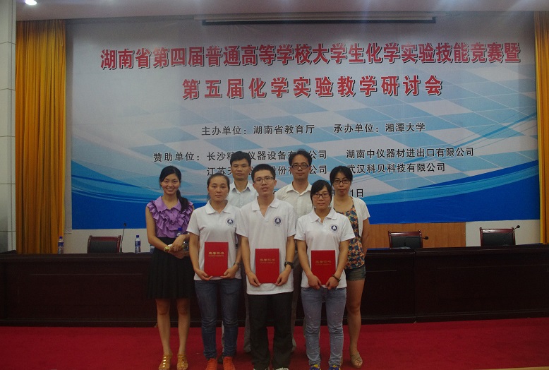 (本网讯)近日,第四届湖南省大学生化学实验技能竞赛在湘潭大学举行。来自中南大学、湖南大学、湖南师范大学及国防科技大学等25所高校的102名选手参加了比赛。我校化学与环境工程学院3位参赛选手不畏强敌,表现优异,取得了骄人的成绩,其中化学工程与工艺专业学生范文娟、李海平获一等奖,高分子材料与工程专业学生王芳获二等奖,总成绩在25所高校中排名第一。