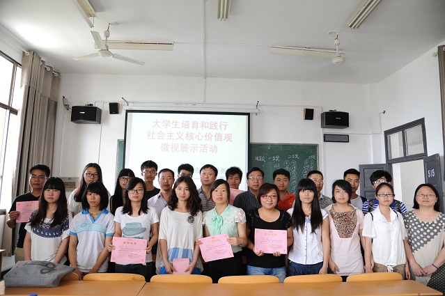 (本网讯)为培育和弘扬社会主义核心价值观,广泛开展社会主义核心价值观宣传教育,67日上午,“大学生培育和践行社会主义核心价值观”微视展示比赛在二教学楼515教室举行。本次比赛由教务处、关心下一代工作委员会、马克思主义学院联合主办。教学督导、离退休工作处、马克思主义学院、教务处、文学院的相关负责人和老师出席比赛并担任嘉宾评委,所有参赛选手担任大众评委。