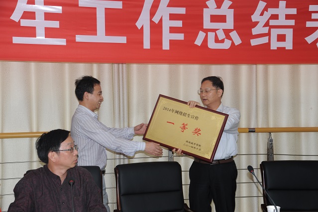 会上,招生就业处副处长郭太平作了学校2014年招生工作总结汇报,文瑞明宣读了《关于表彰江南在线2014年网络招生宣传先进集体的决定》、《关于江南在线2014年新生报到率奖励的决定》。