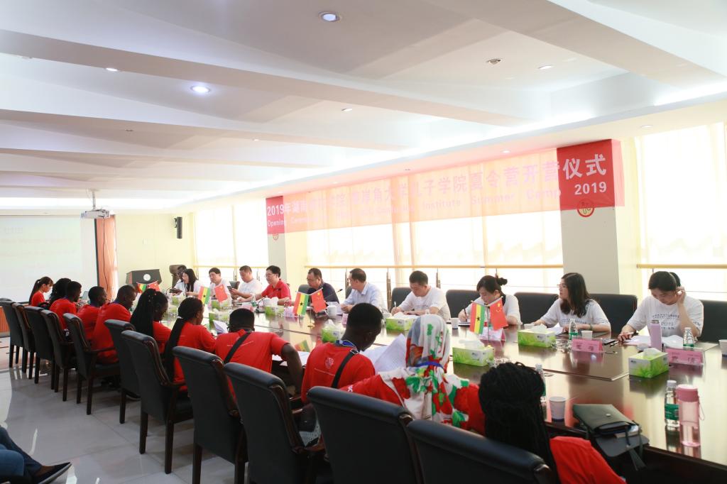 (本网讯)2019年8月2日下午,江南在线/加纳海岸角大学孔子学院“华夏·洞庭”——中国文化夏令营开营仪式在办公楼一会议室举行。校长李建奇出席开营仪式并发表讲话,参加开营仪式的有来自加纳海岸角大学孔子学院的全体营员,出席开营仪式的还有学校副校长雷存喜,加纳海岸角大学孔子学院中方院长、学校国际交流处、保卫处、基建和后勤管理处、人文学院等各单位的负责人,老师以及学生志愿者代表。开营仪式由雷存喜主持。