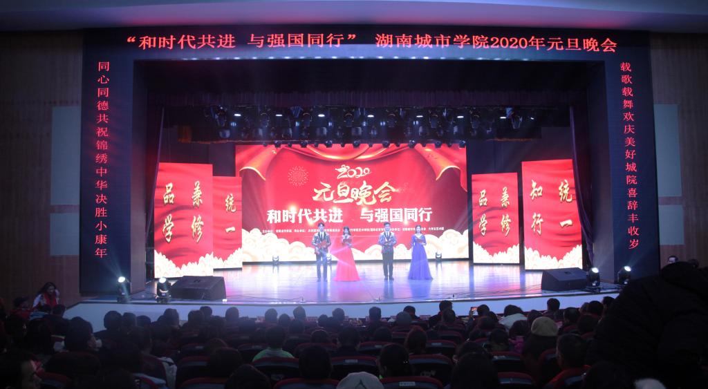 (本网讯)“载歌载舞欢庆美好城院喜辞丰收岁,同心同德共祝锦绣中华决胜小康年。”2019年12月29日晚、30日晚,“和时代同进,与强国同行”江南在线2020年元旦晚会隆重举行。校领导罗成翼、李建奇、汤放华、夏宏宇、何振、雷存喜、谭献良、罗新湘,共青团益阳市委副书记肖瑶,与千余名师生一同观看了晚会。