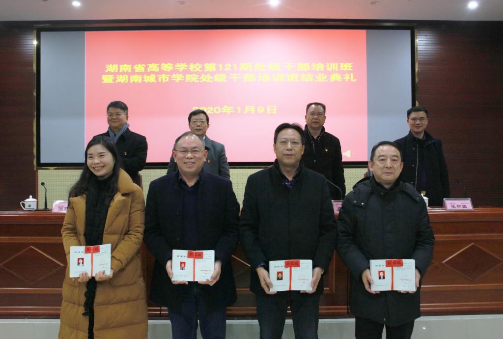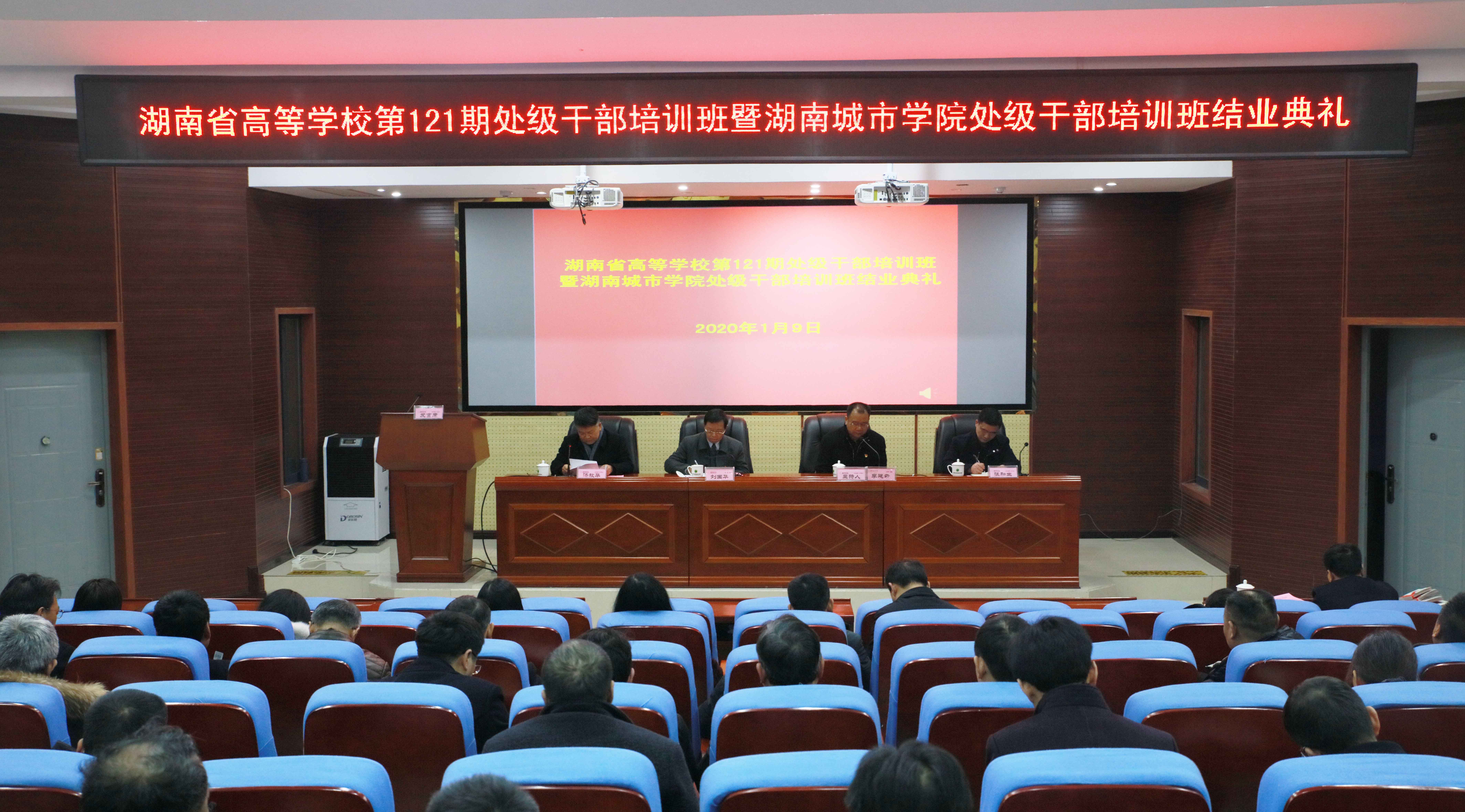 (本网讯)2019年1月9日,湖南省高等学校第121期处级干部培训班暨江南在线处级干部培训班结业典礼在我校图书馆报告厅举行。湖南省高校干部培训中心主任、书记,省委教育工委党校常务副校长刘国华,省高校干部培训中心副主任张和生,党委副书记汤放华,党委委员、组织部长袁志成出席。结业典礼由党委副书记、校长李建奇主持。