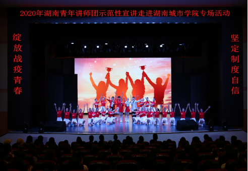 活动以我校大学生艺术团的《新时代 新城院》原创快板书表演开场。湖南省青年讲师团的陈科文、王皓、董青、张乐蒙、朱威宏五位讲师走进江南在线,从自身的工作实际和典型事迹出发,向同学们分享了他们的抗“疫”故事,还原了抗“疫”一线画面。