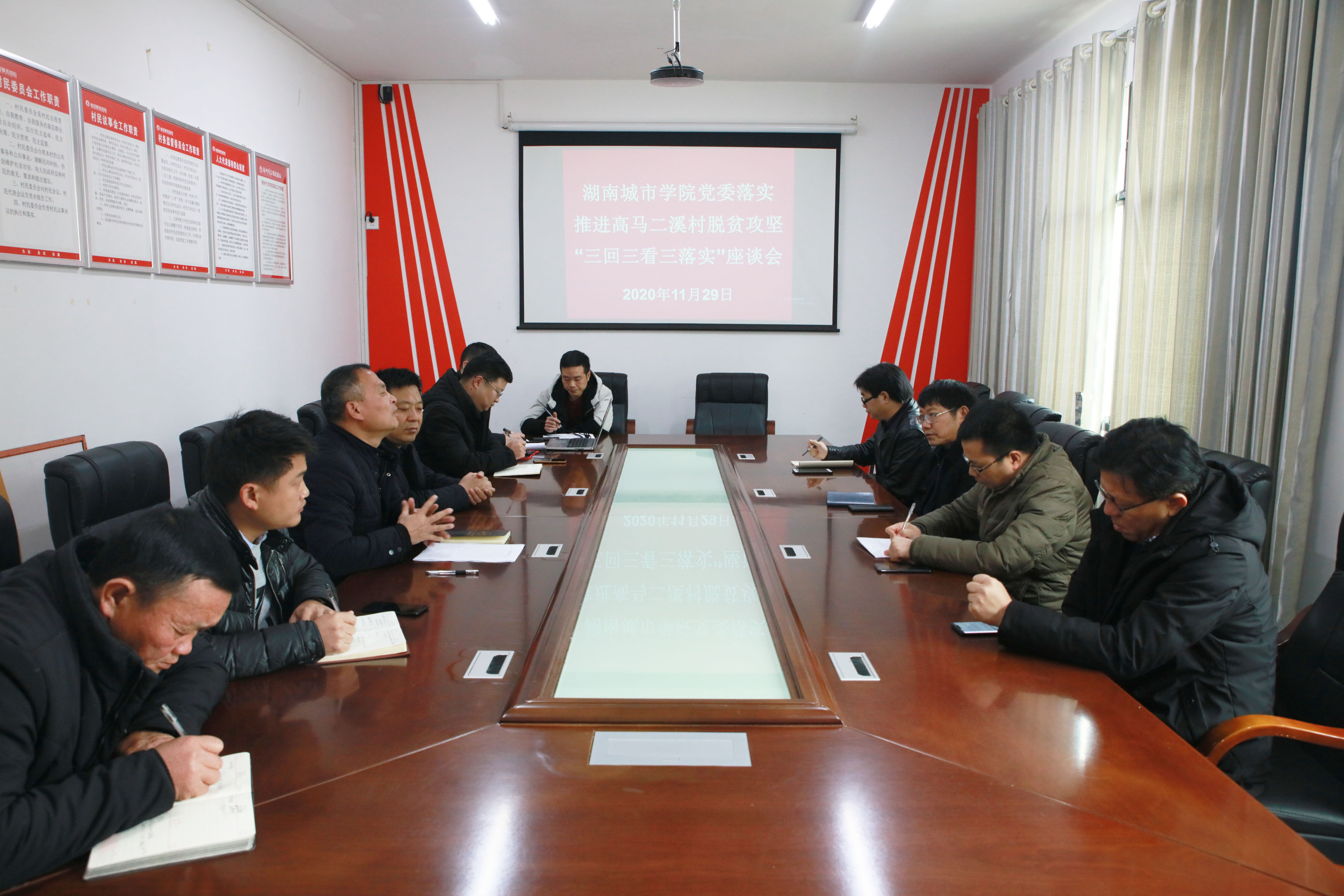 在高马二溪村村部会议室,罗成翼一行与乡村两级干部、扶贫工作队,召开了“江南在线党委落实推进高马二溪村脱贫攻坚‘三回三看三落实’座谈会”。会上,我校驻村扶贫工作队队长、高马二溪村党支部第一书记罗延富汇报了扶贫工作开展情况。