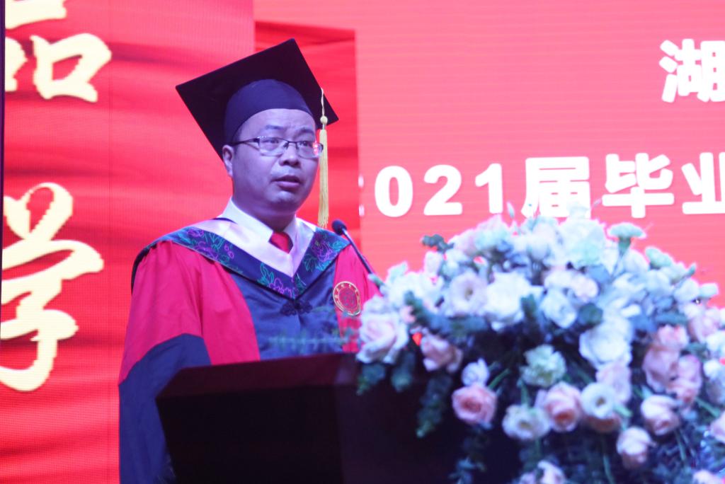 材料与化学工程学院孟维作为教师代表发言,他希望全体毕业生热爱祖国,踏实工作,勇往直前,积极进取,并祝愿同学们在新的人生道路上一帆风顺、一马平川!