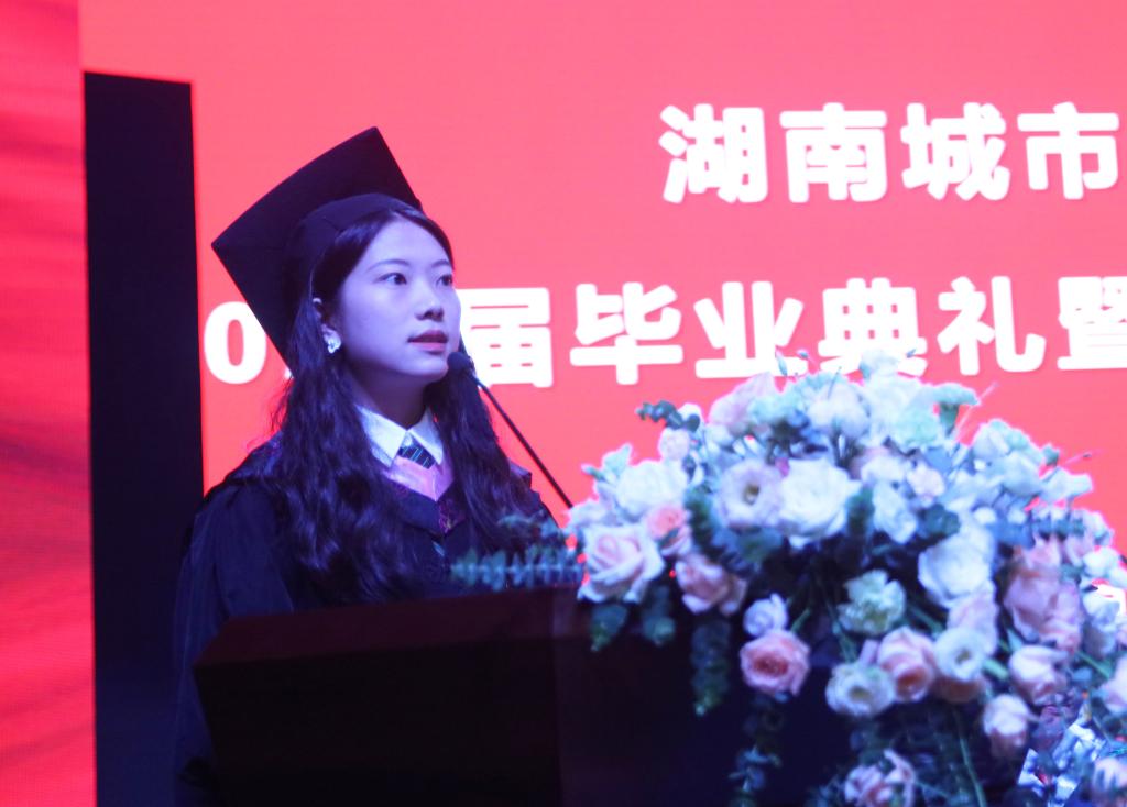 2017级商务英语专业胡赛男同学代表毕业生发言,她讲述了大学生涯给自己带来的收获,代表2021届毕业生表达了对学校和老师的感激之情,并向母校承诺:作为新时代的城院学子,定当不负韶华,努力奋斗,担当起时代赋予的使命,用自己的青春书写最绚丽的中国梦。