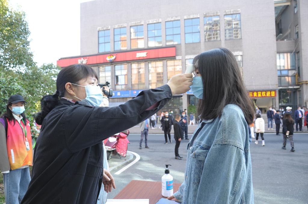 学生在寝室出现体温异常后宿管员用额温枪为其测量体温。