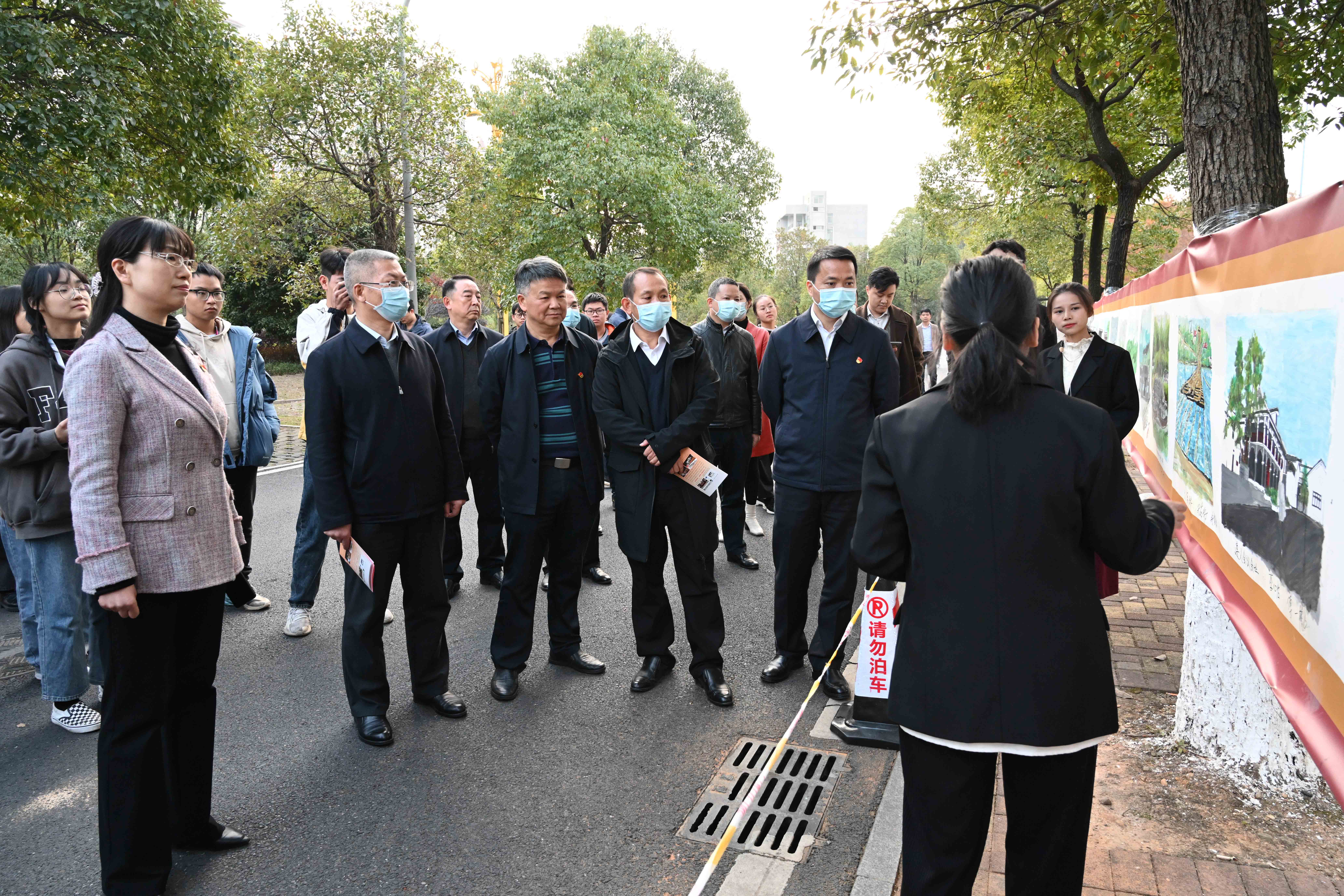 指导组一行首先来到我校建筑与城市规划学院举办的“百栋历史建筑 呈现百年风华”手绘作品展览现场,饶有兴致地听取了学生解说员的介绍,对同学们绘制百座中国红色地标建筑致敬党的百年华诞,真正将专业课程和党史学习有机融合的方式表示高度赞赏。