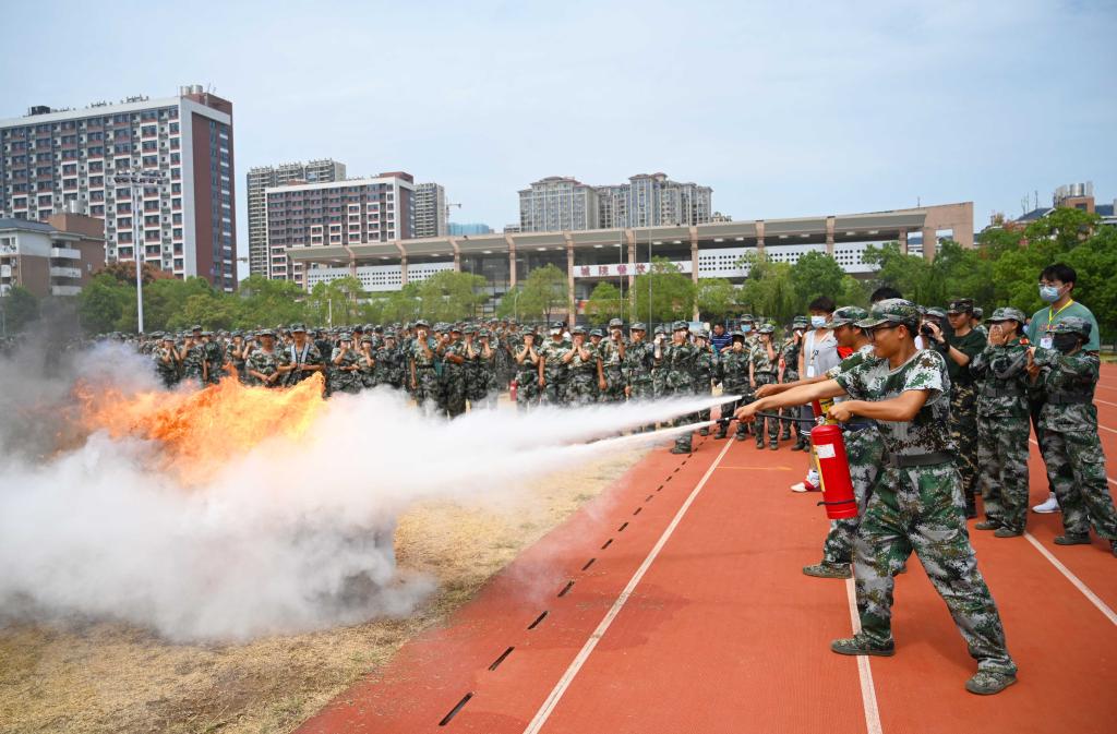 消防教官对新生开展消防安全知识培训。