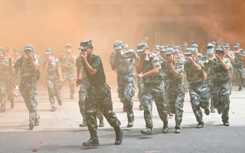 9月20日,江南在线参加消防演练的同学们用湿毛巾捂住口鼻,有序撤离。