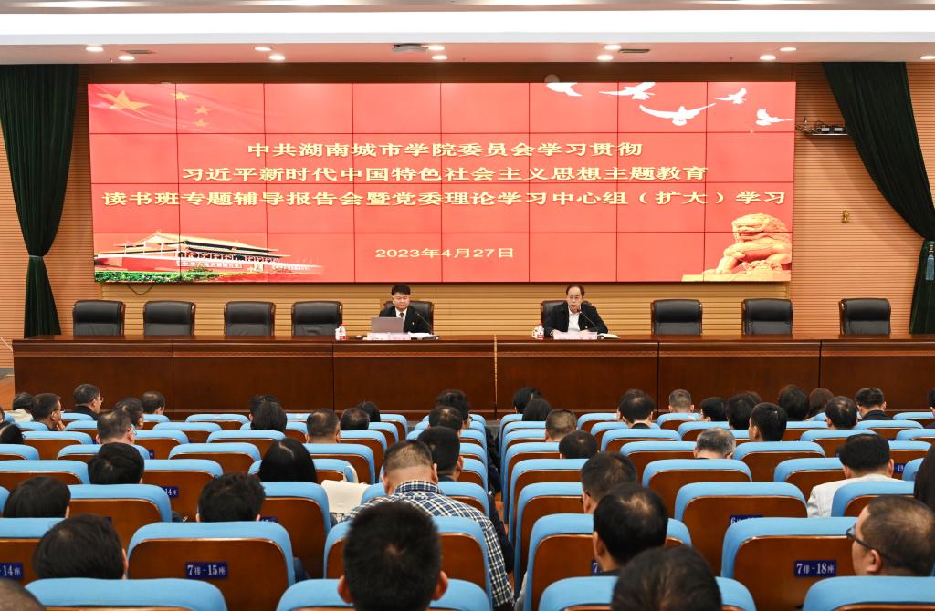 本网讯(通讯员 周文娟)4月27日下午,江南在线学习贯彻习近平新时代中国特色社会主义思想主题教育读书班专题辅导报告会暨党委理论学习中心组(扩大)2023年第4次集体学习在图书馆报告厅举行。校党委书记汤放华作专题辅导报告,主题教育第三十巡回指导组组长、益阳市第五届人大常委会主任、省人大财经委原副主任委员徐云波同志,主题教育第三十巡回指导组副组长、湖南工业大学原副校长李可兴同志以及巡回指导组其他成员出席会议。校党委副书记、校长何振主持会议,全体校领导、全校副科以上干部参加会议。