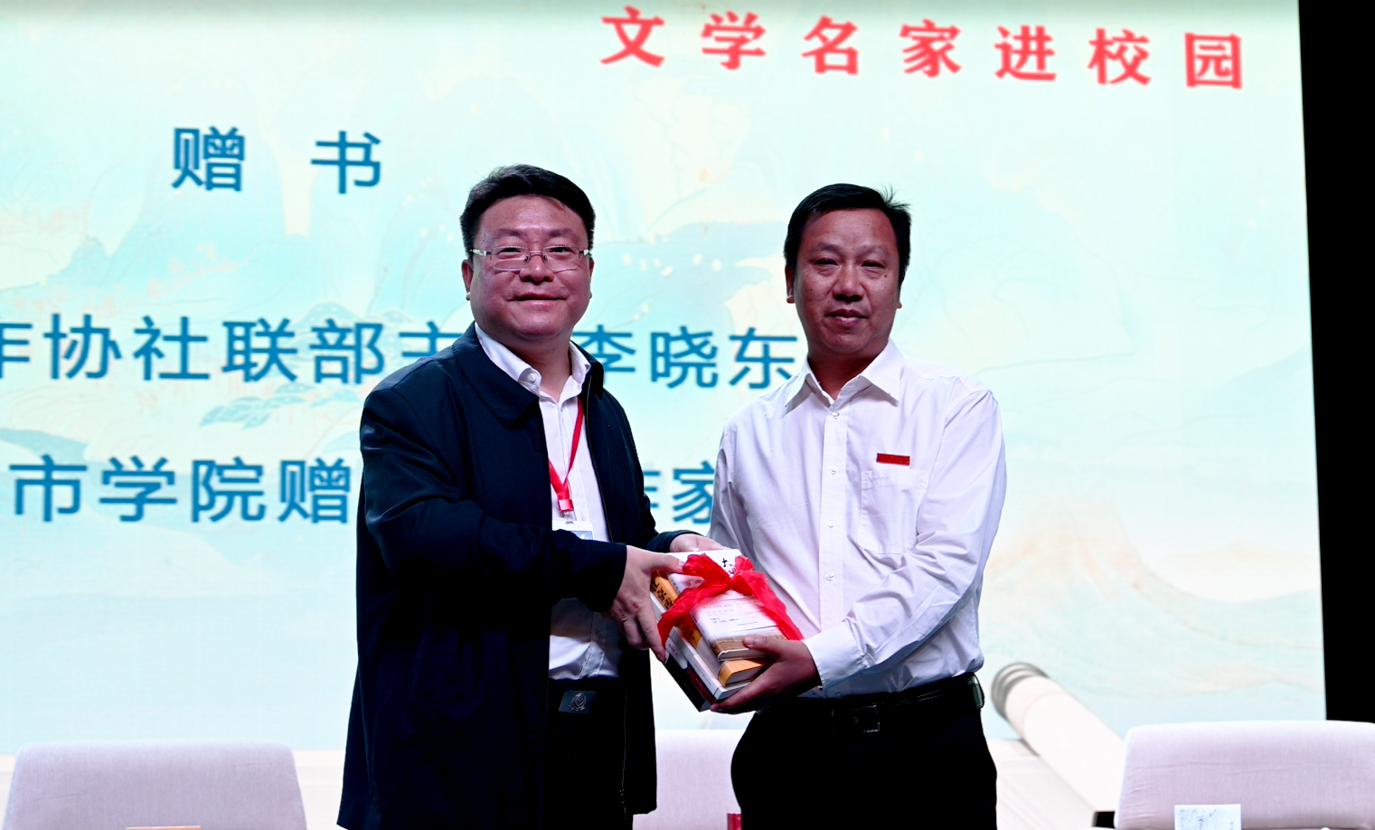 接下来,举行了受邀作家向江南在线赠书仪式,学校图书馆馆长莫连光代表学校接受了赠书。