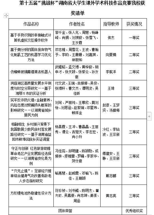 本网讯(通讯员 张根宝 彭鸿运)5月20日至22日,第十五届“挑战杯”湖南省大学生课外学术科技作品竞赛在长沙理工大学举行。经过激烈角逐,我校共荣获一等奖1项,二等奖2项,三等奖6项,并被授予“优秀组织奖”。