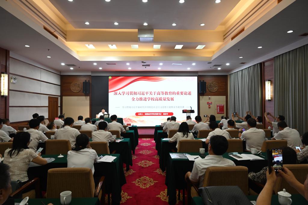 下午,全体成员在韶山宾馆会议室进行了“以学增智”专题学习研讨。汤放华以《深入学习贯彻习近平关于高等教育的重要论述 全力推进学校高质量发展》为题,为大家上了一堂深刻的党课。汤放华紧密结合当前高等教育新形势和学校发展新情况,通过详实的数据对比、丰富的案例讲解,从领会精神、再学习再思考习近平总书记关于教育重要论述,审时度势、切实增强教育强国的责任感使命感和紧迫感,狠抓落实、谱写新时代新征程江南在线高质量发展新篇章三个方面,阐述了学习贯彻习近平总书记关于教育的重要论述我们要做什么、怎么做的问题。