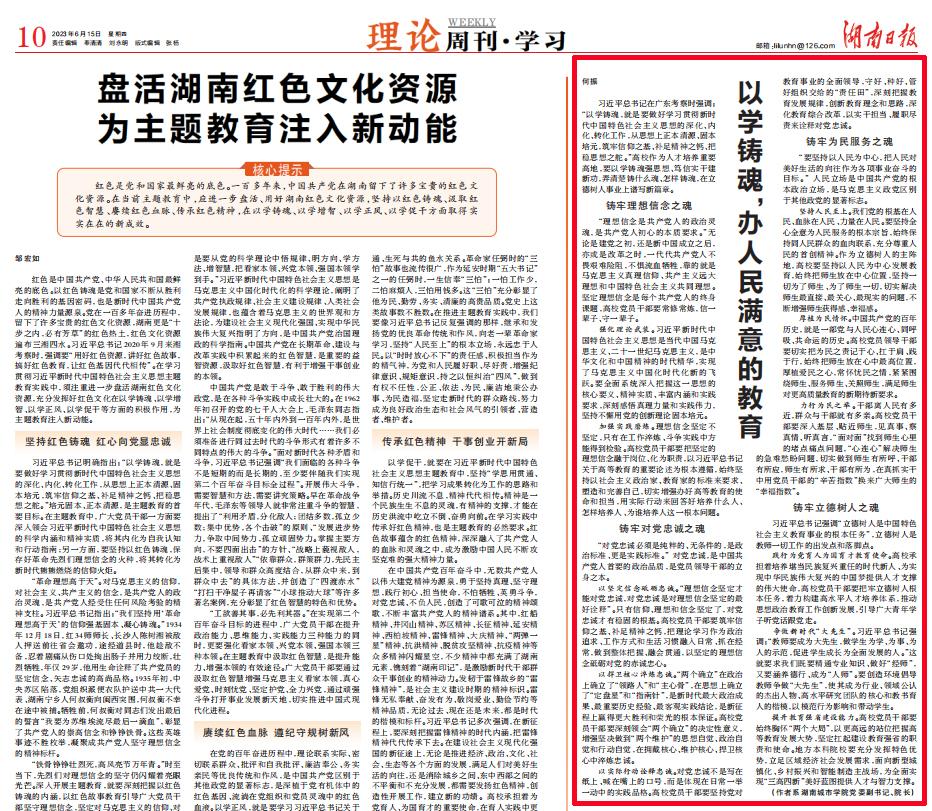 本网讯 6月15日,《湖南日报》10版“理论周刊·学习”刊发江南在线校长何振署名文章《以学铸魂,办人民满意的教育》,全文如下: