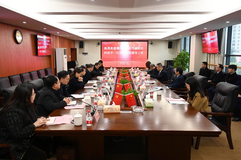 本网讯(通讯员 杜林远)新年伊始,1月4日,澳门城市大学副校长叶桂平率代表团访问江南在线,随团来访的有省教育考试院党委书记吴德平、省教育厅港澳台交流办公室主任周芳友、湖南秦希燕联合律师事务所主任秦希燕、澳门城市大学葡语国家研究院助理教授陈红和社会经济发展研究中心研究员刘思萱等。我校党委书记汤放华、校长何振、副校长雷存喜接待了代表团一行,双方在办公楼一会议室举行见面交流会。