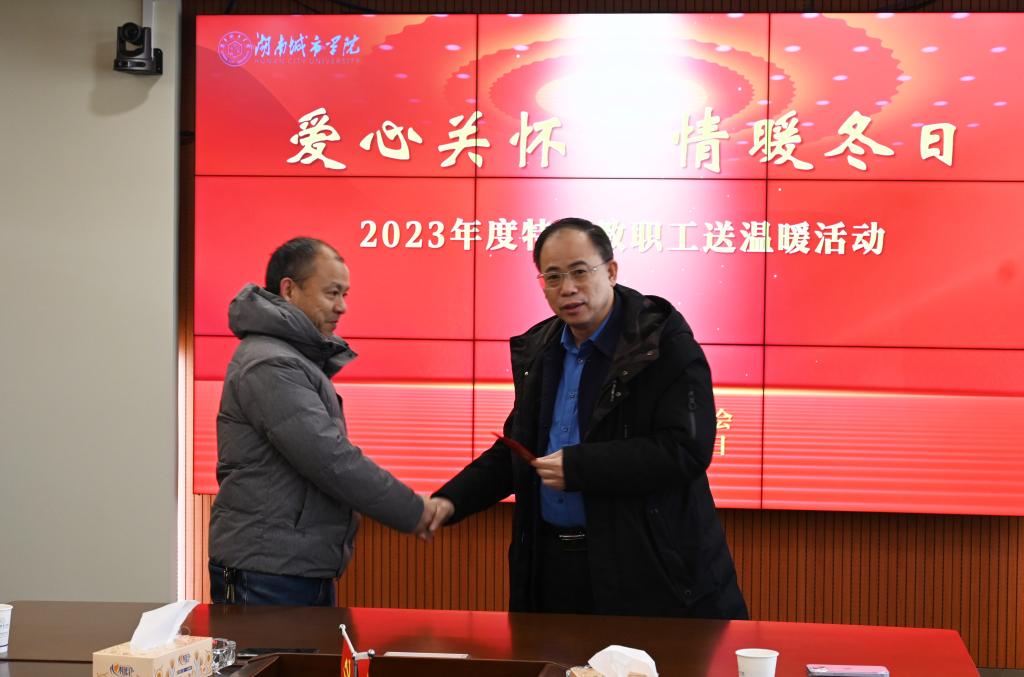 本网讯(通讯员 周敏)爱心关怀,情暖冬日。1月23日上午,学校在办公楼一会议室开展2023年度为困难教职工送温暖活动。校党委书记汤放华,校长何振出席,困难教职工代表及工会全体人员参加。活动由副校长谭献良主持。