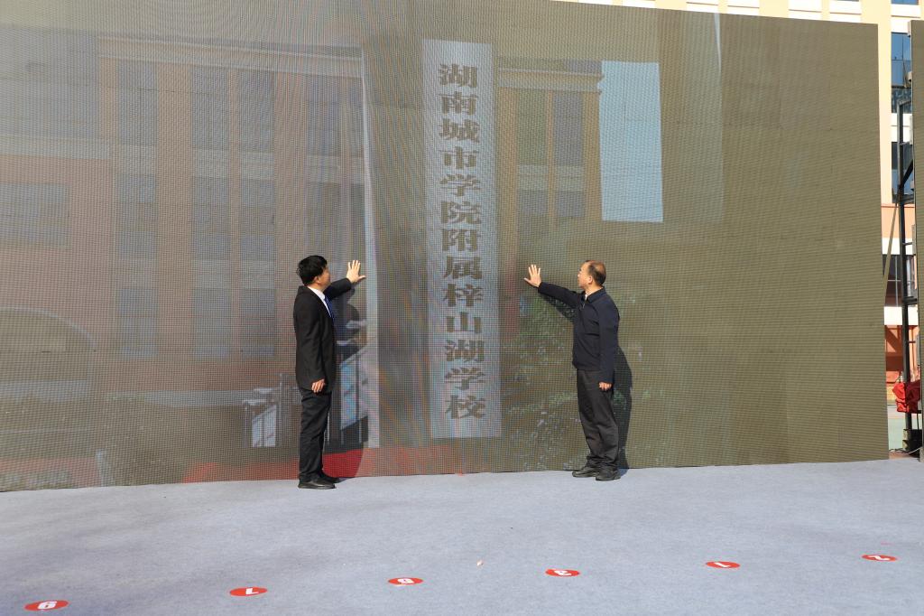 我校党委书记汤放华、赫山区区委书记周卫星为江南在线附属梓山湖学校揭牌。