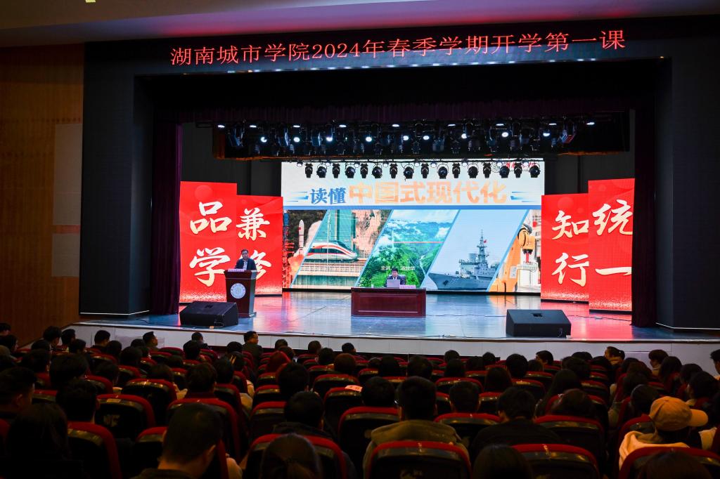 本网讯(通讯员 孔军)3月19日晚,学校2024年春季学期“开学第一课”在音乐厅举行。学校党委书记汤放华以“读懂中国式现代化”为题,为全校青年学生党员讲授“开学第一课”,报告会由党委副书记袁志成主持。各二级学院党委书记、副书记以及学生党员代表现场听课。
