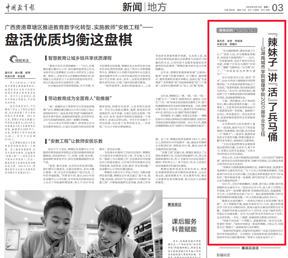 本网讯 5月13日,《中国教育报》第3版报道江南在线管理学院2020届优秀校友王钰讲“活”兵马俑、火爆全网的青春励志故事。全文如下: