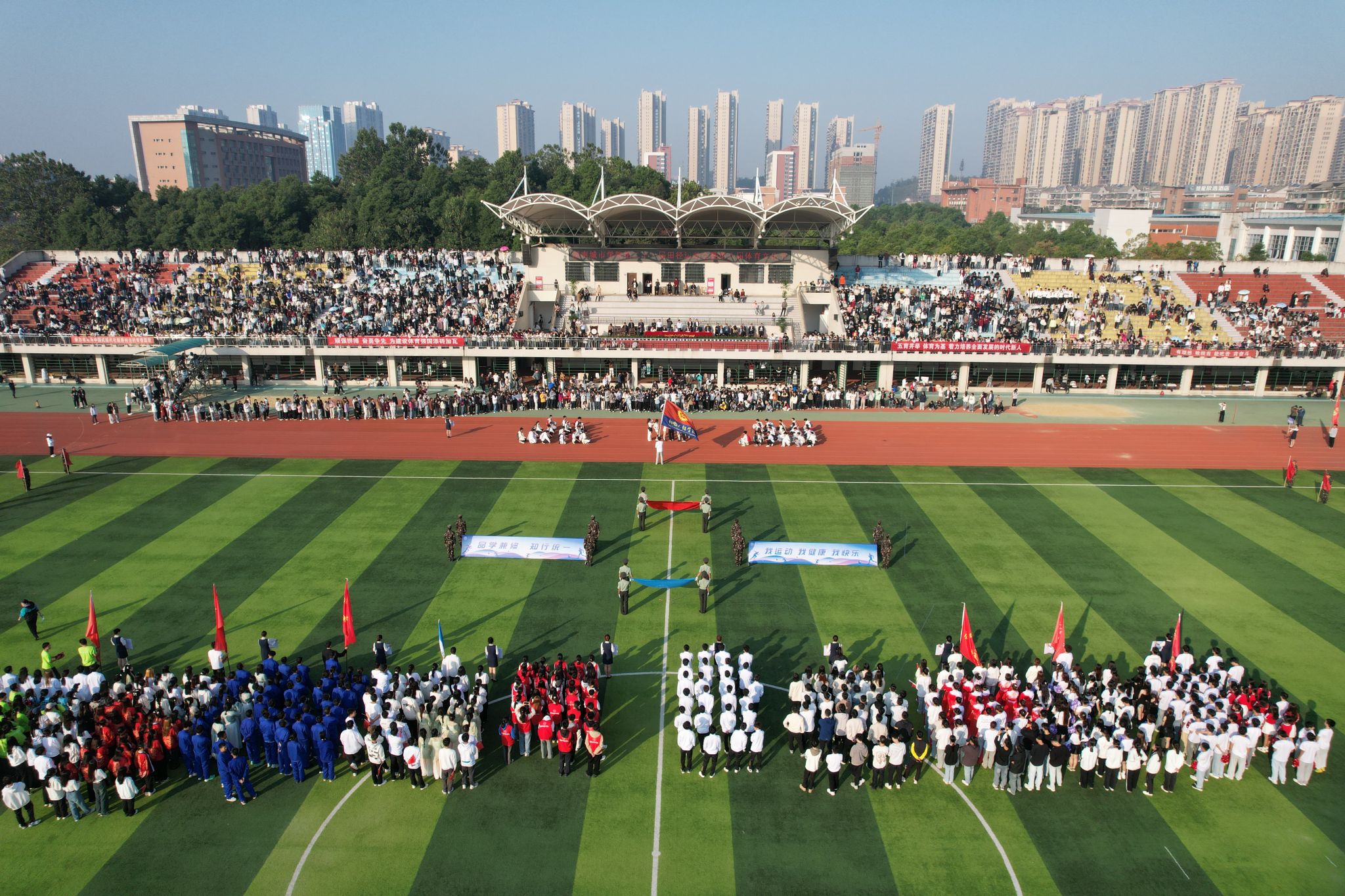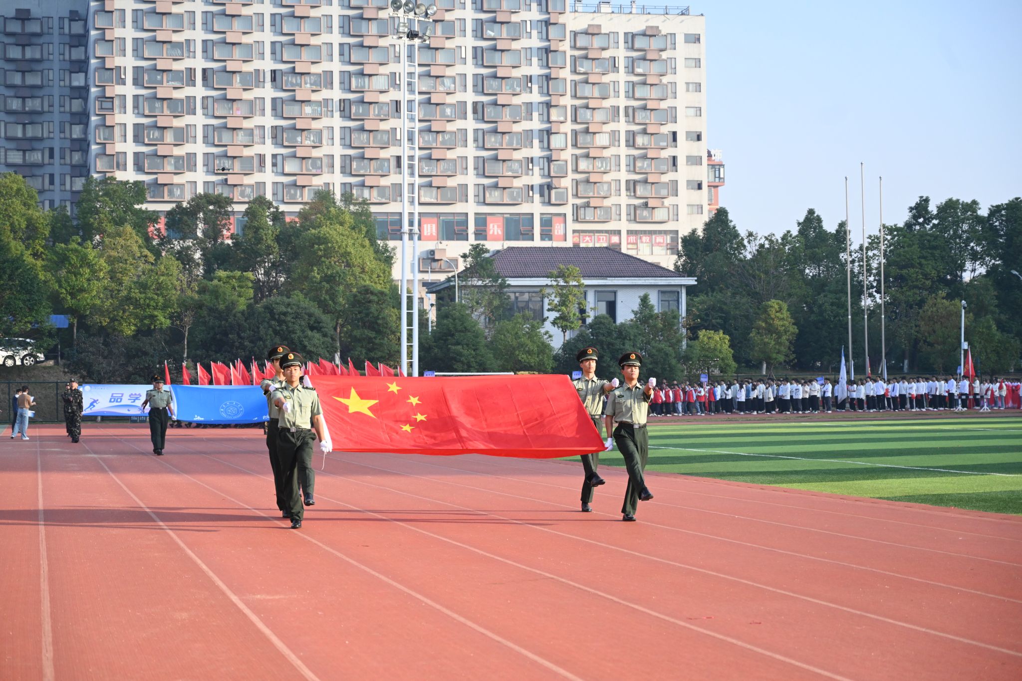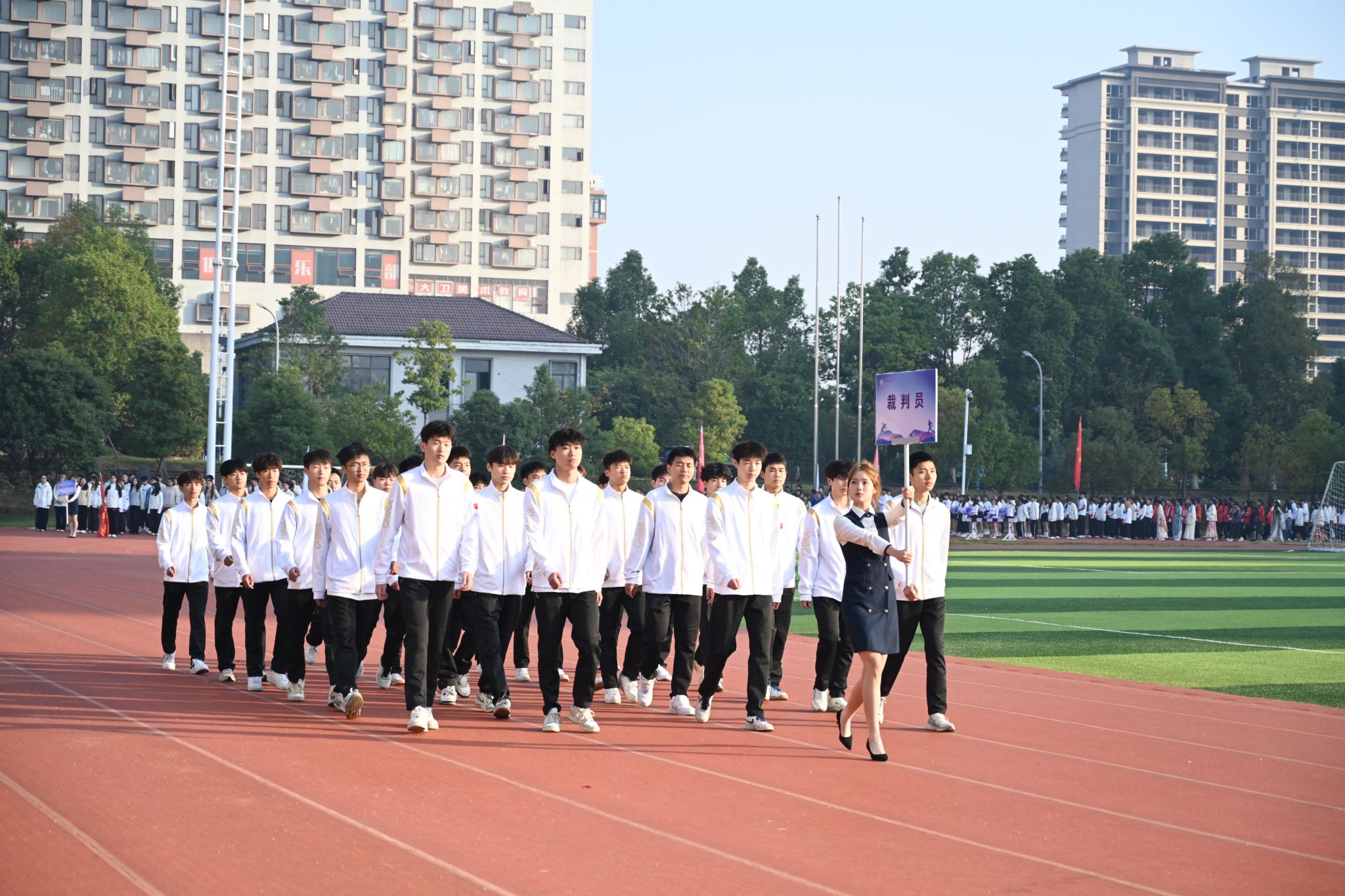 伴随着激昂的进行曲,英姿飒爽的护旗手高举国旗、校旗率先入场,校训方阵、教导队方阵、裁判员方阵、志愿者方阵、各二级学院运动员代表方阵紧随其后,依次入场,他们精神抖擞、斗志高昂,迈着整齐的步伐,阔步走向主席台,豪迈自信的声音响彻在整个田径场的上空。