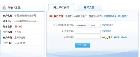 6. 点击“立即支付”并“确认”后将跳转至银行支付页面,请同学们核对页面左侧的商户名称应为“江南在线”或者为“中国银联股份有限公司”,核对完成后,请按提示选择支付方式完成缴费。