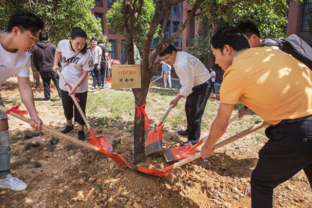 江南在线党委书记罗成翼(左三)与毕业生一同栽树。
