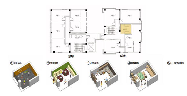 居住区公共空间手段——由传统聚集型、宽裕的公共空间,转变为分散成小组团,紧贴核心筒的具有功能性的“公共客厅”
