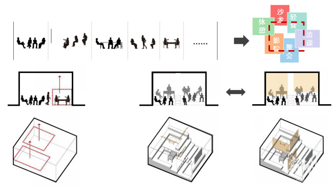 首层公共空间手段——打造复合性多功能空间,营造场域感。有效利用4m层高,打造多层次空间。通过高差打造满足不同性质的活动空间:既能各自独立使用,由垂下的轻纱进行简易分隔;又能作为开敞的沙龙空间。保证了空间的高效利用性。