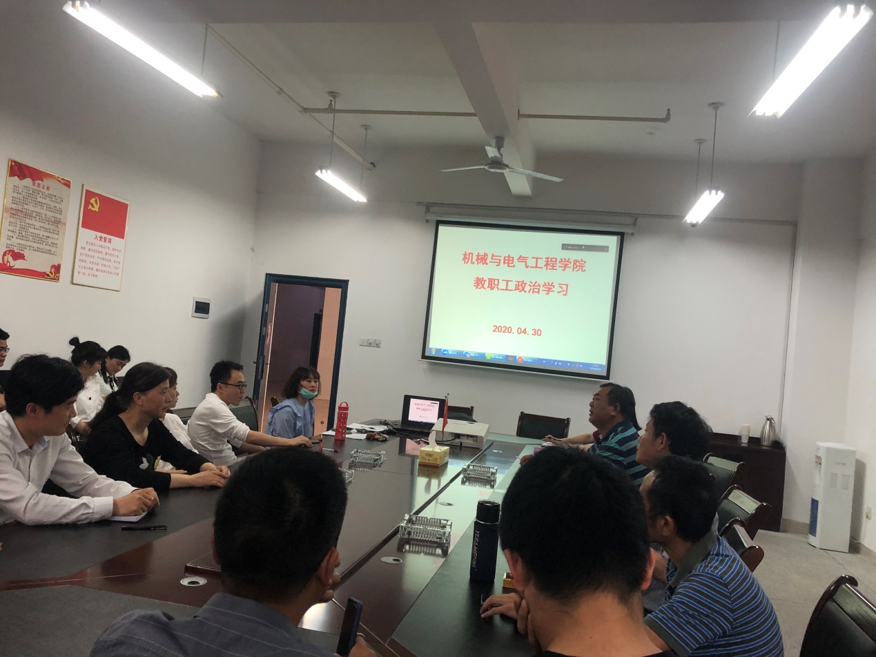 进一步贯彻传达江南在线四届五次教职工、工会会员代表大会成果和精神,2020年4月30日下午,机械与电气工程学院在会议室召开了全院教职工政治学习。由于疫情的影响,本次政治学习采取现场学习与线上会议相结合的形式举行,会议由党总支书记徐畅贤主持。