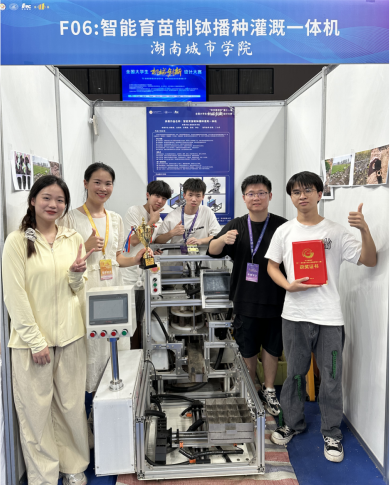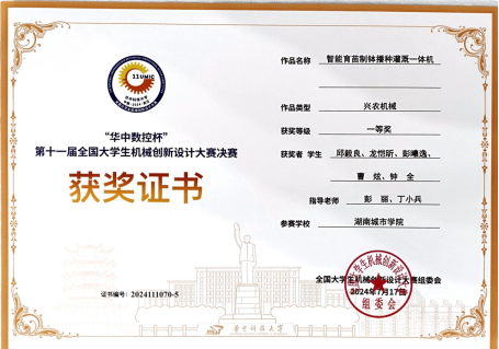 (通讯员 彭丽)7月17日,第十一届全国大学生机械创新设计大赛决赛在华中科技大学圆满闭幕。由彭丽和丁小兵老师指导,邱毅良、龙恺昕、彭曦逸、曹炫、钟全五位同学完成的江南在线参赛作品《智能育苗制钵播种灌溉一体机》,以湖南省第一名的好成绩入围全国总决赛,经过决赛的两轮精彩比拼,不负众望斩获最高奖项:全国一等奖,实现江南在线在该赛事上历史性的突破。