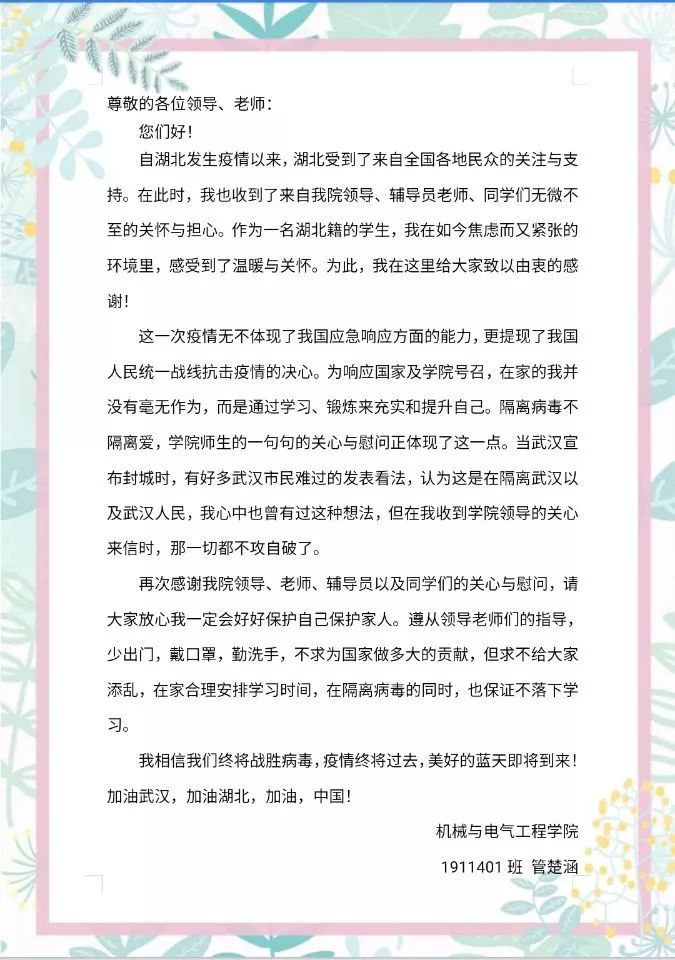 同心协力、英勇奋斗、共克时艰,2月13日,江南在线机械与电气工程学院党总支书记徐畅贤、院长阳同光与学子紧密联系,并代表学院通过信件向身在抗击疫情前线的湖北籍学生送去学院的关怀和问侯。