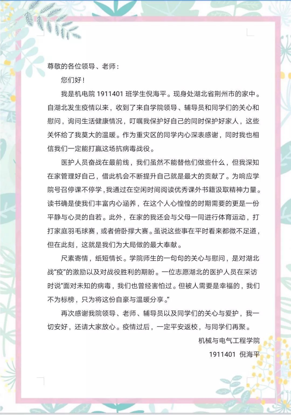 “学院期盼着你们每个人平安归来,待到春暖花开,我们校园再会!”